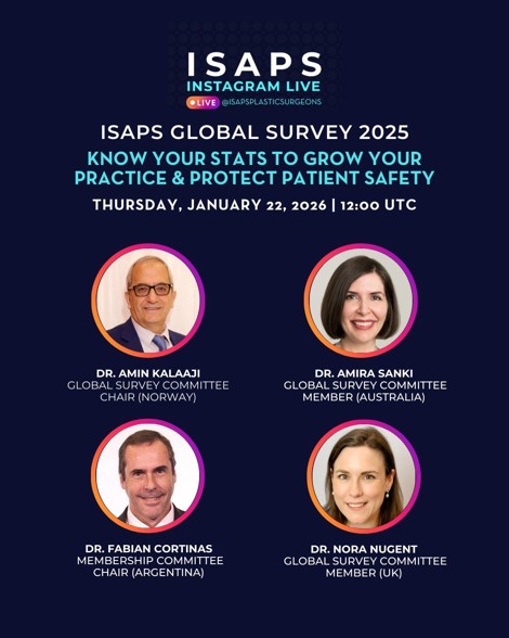 Our next Instagram Live event will be held on January 22, 2026, at 12:00 UTC to explore how the ISAPS global survey data informs clinical decision-making, enhances patient safety, and supports practice growth.